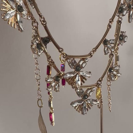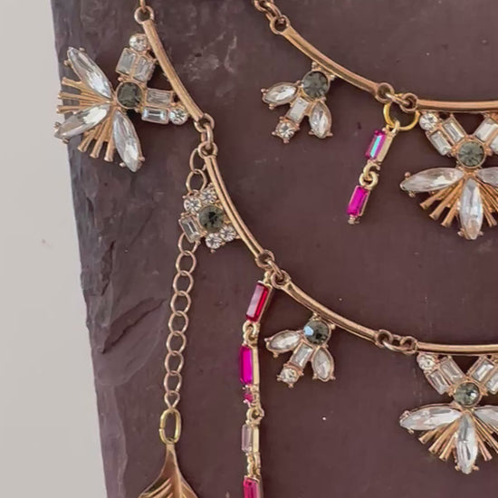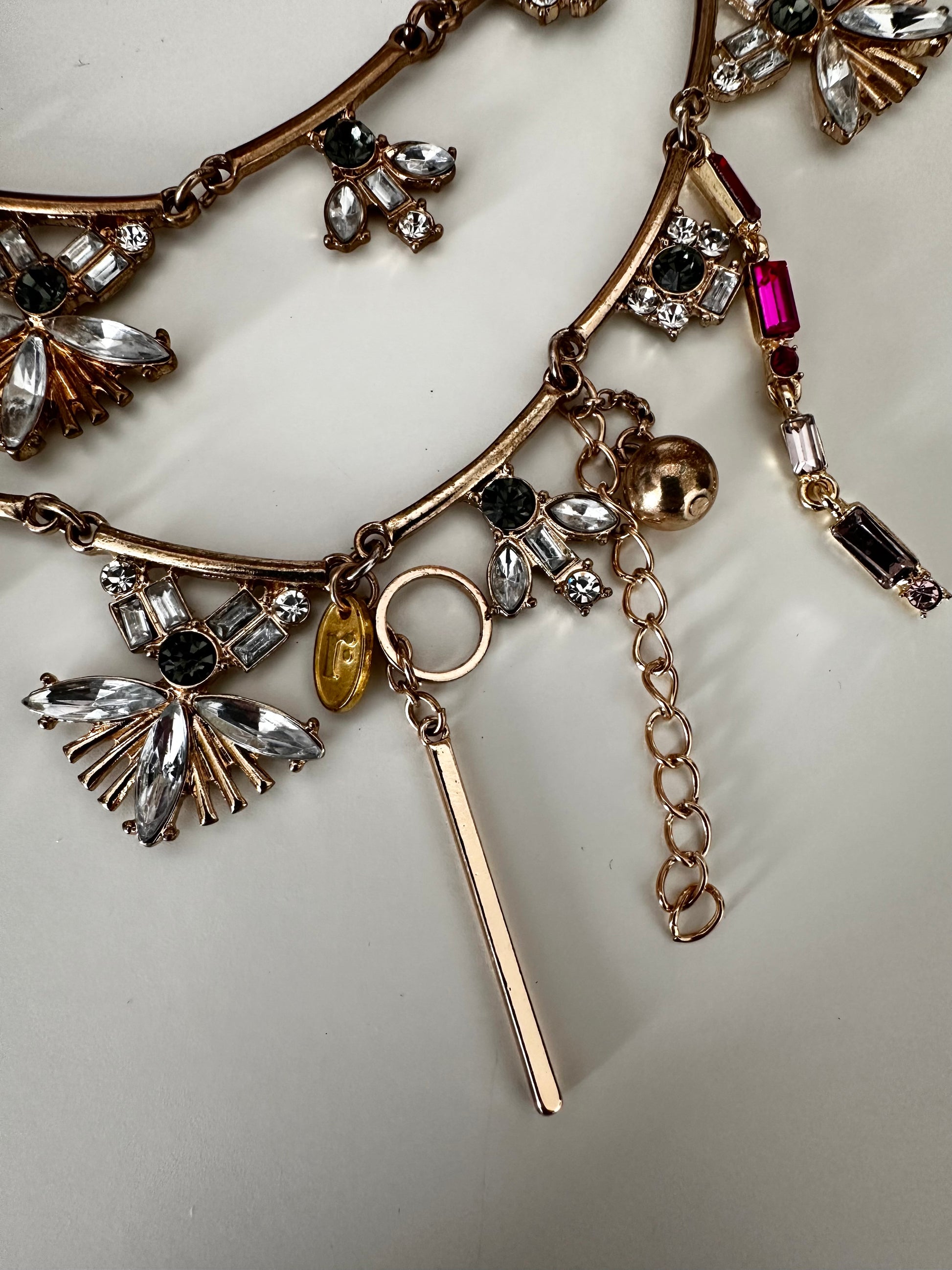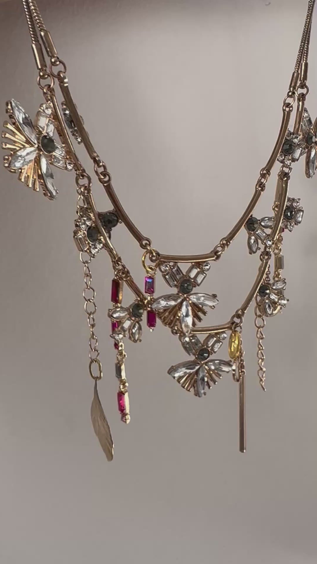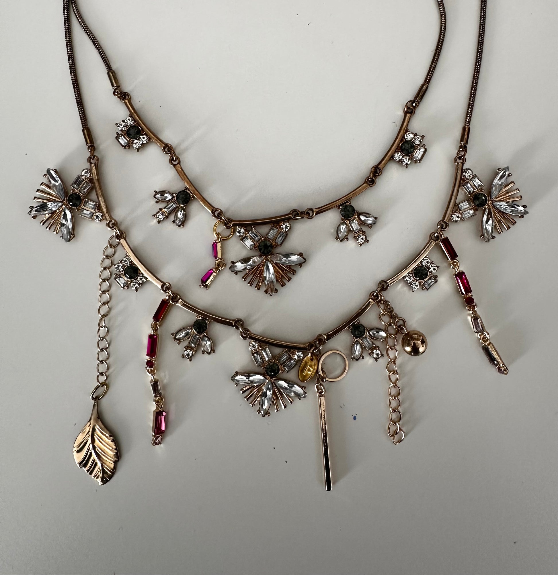 One-of-a-kind layered necklace with a unique curation of charm dangles. This piece is perfect for party season and beyond. Beautiful faceted gems in a floral design adorn both layers of this bracelet. The longer layer has a selection of pink toned gems, golden chains and charms including golden leaf, ball, ring and matchstick.