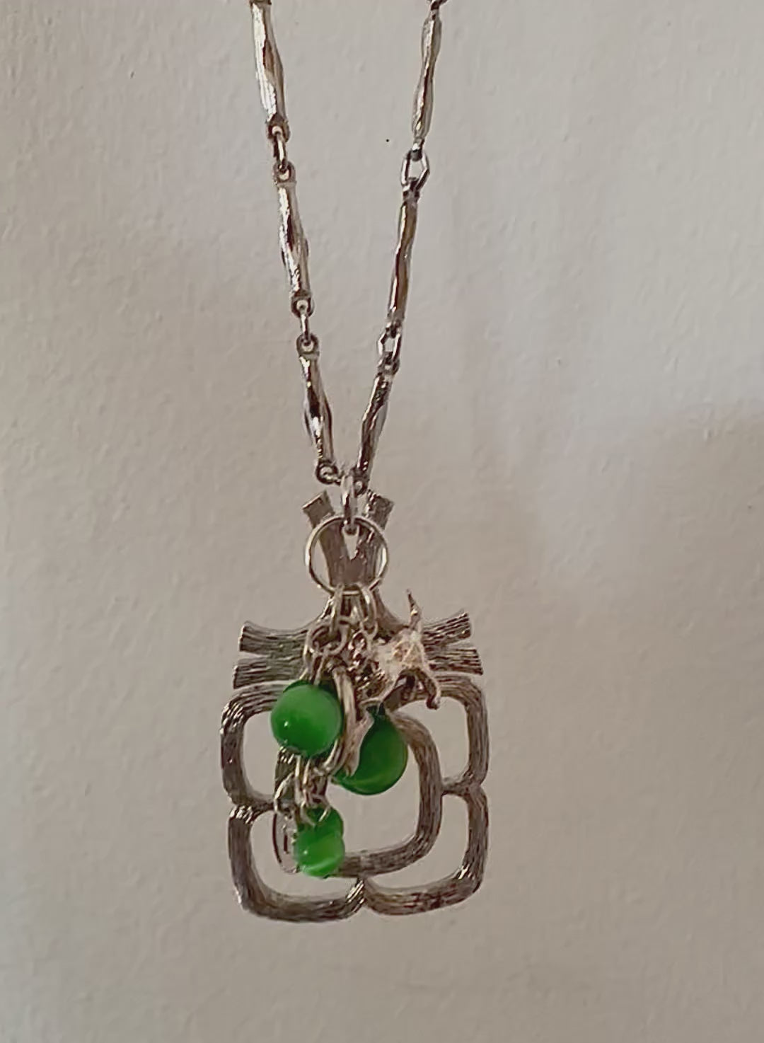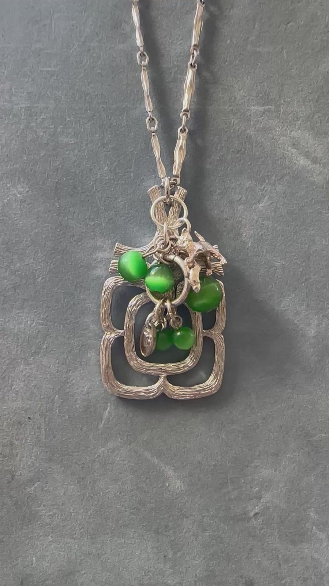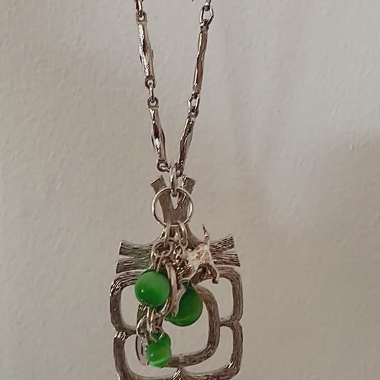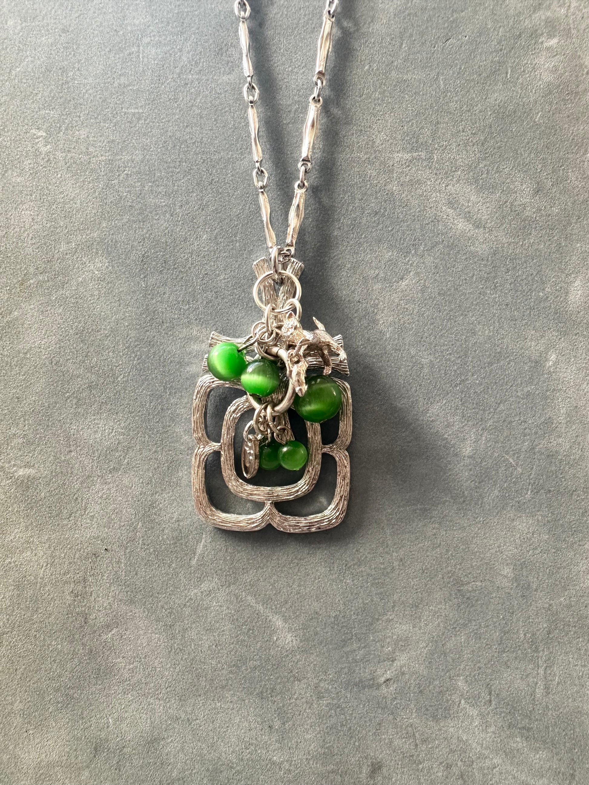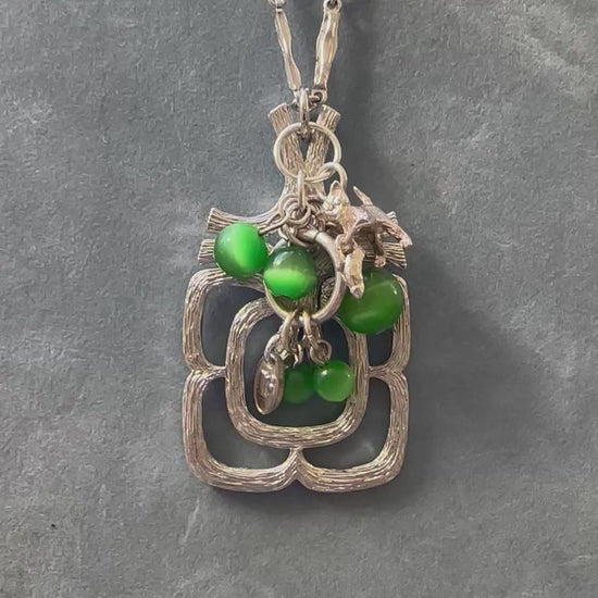 This one-of-a-kind piece includes a 1970s brutalist/ modernist pendant necklace adorned with a curation of vintage charms. The longer length chain has a lobster clasp to back but can also slip over the head with ease and is a silver tone with brushed texture. Charms include a sterling silver cat with mouse dangle and waterfall glass beads. Finished with a Regilt Tab.